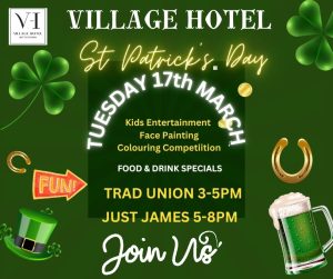 Join us at the Village Hotel this St Patrick’s day where we’ll have kids entertainment, food and drink specials and lots more on offer. Live music will be provided by